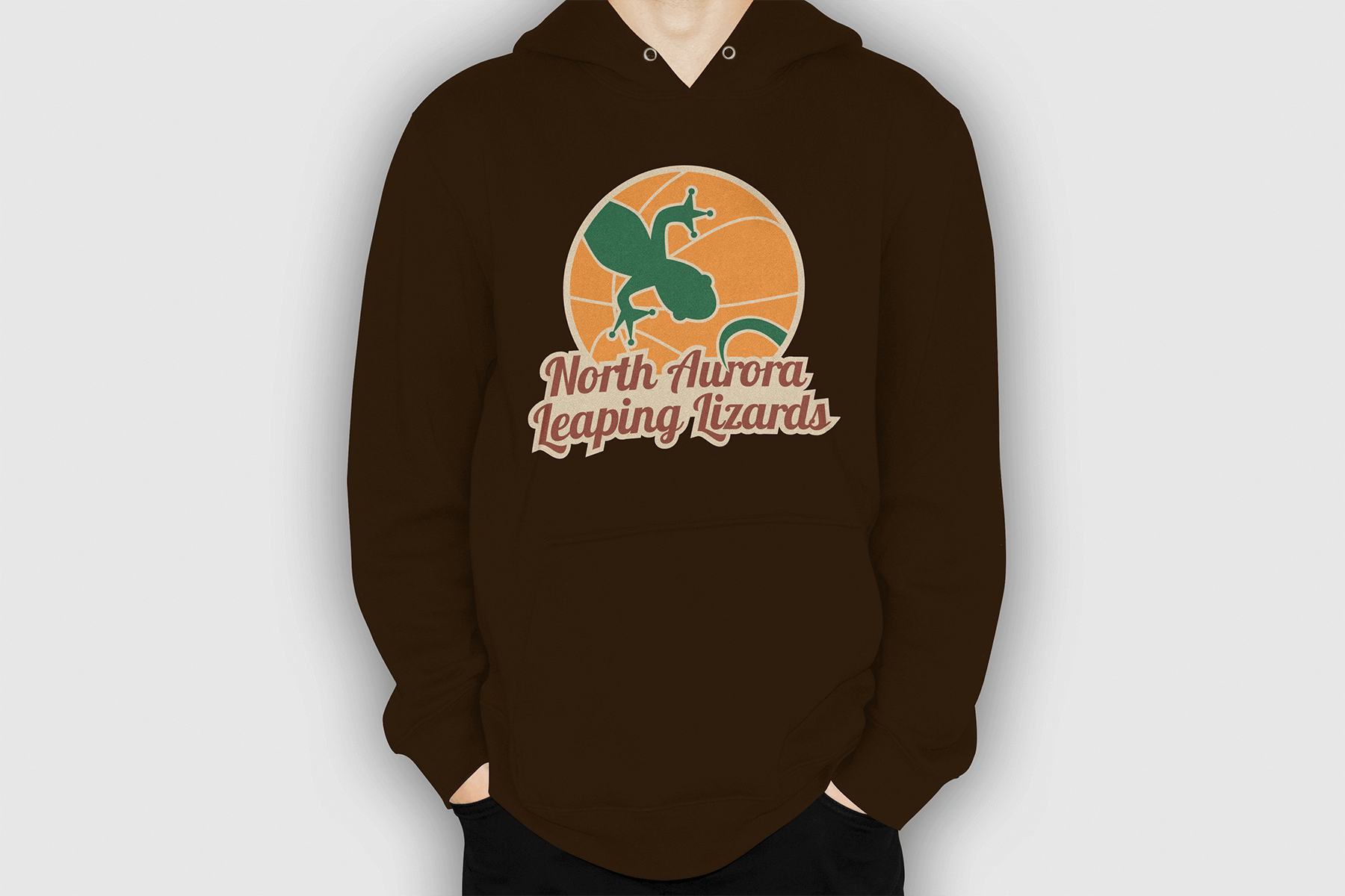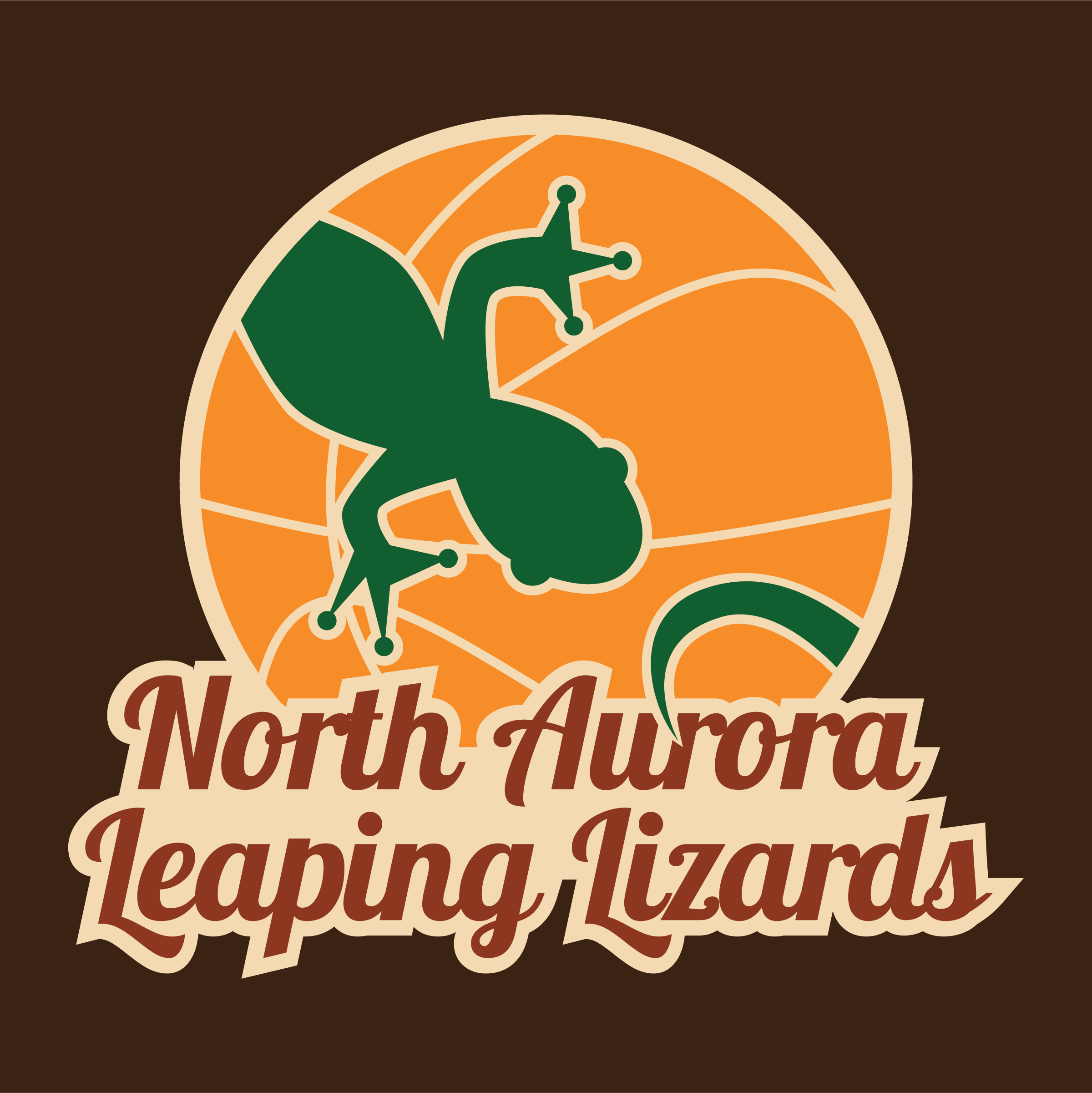 llustrative logo for a fictional minor basketball team, the North Aurora Leaping Lizards. Created using three colors, orange, green and red, and different tints to create shading and accents. This project was completed for the Digital Illustration Class at the College of Dupage in the Spring of 2017.